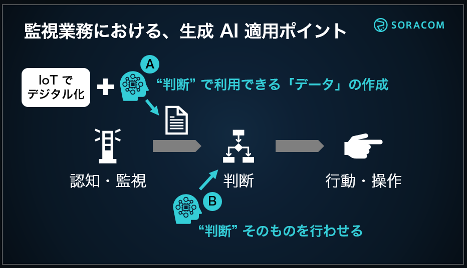 監視の核は状態把握です。そこにAIを重ねると判断における材料づくりの効率化、そして判断そのものの自動化と、業務の省力化につながります。