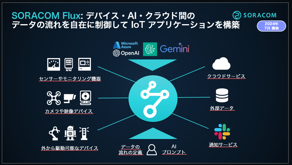 SORACOM Fluxは、デバイス・AI・クラウドをつなぎ、IoT データの流れをローコードで定義できます。