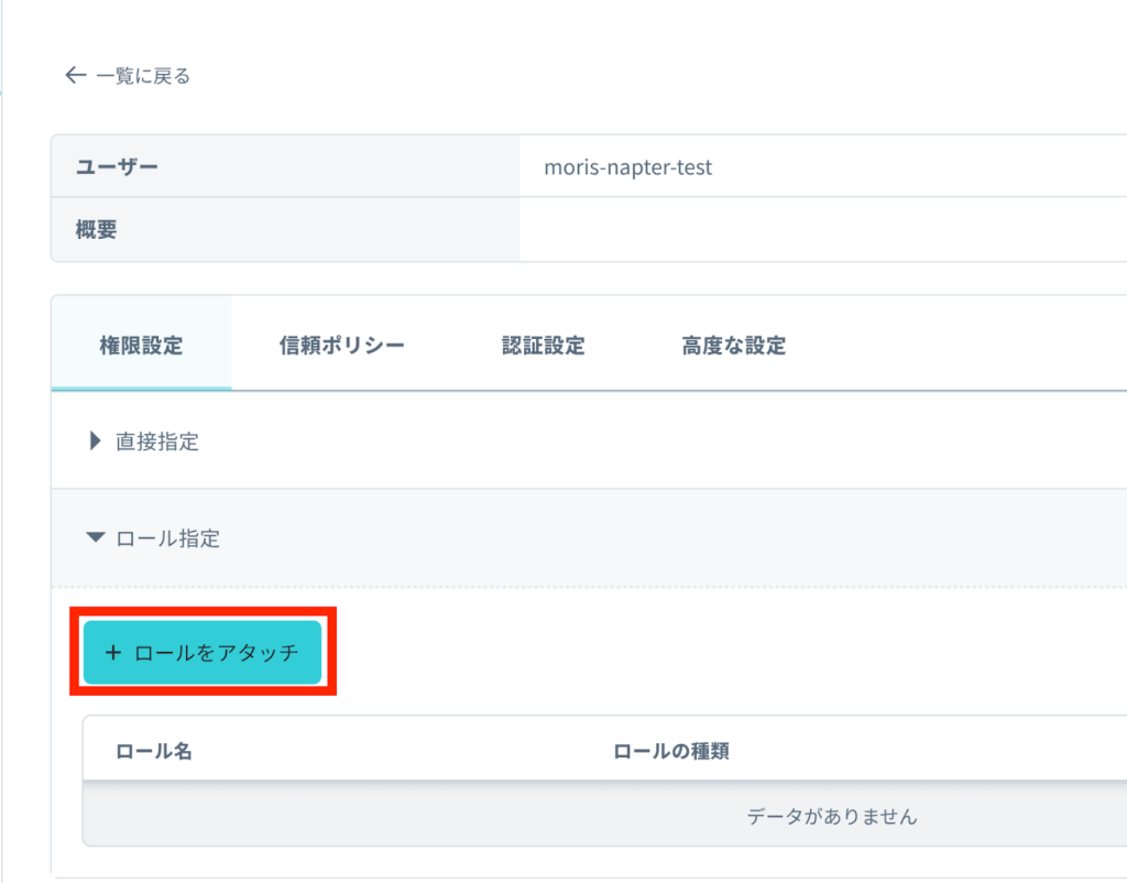 下の方の「ロール指定」セクションの「+ ロールをアタッチ」ボタンをクリックします。