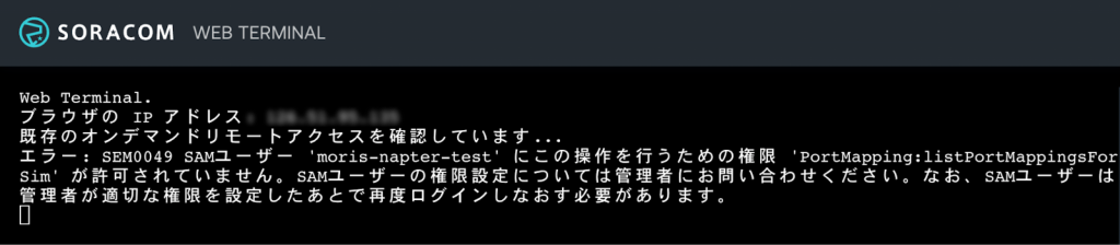 次は別のSIMにリモートアクセスを作成してみましょう。オンデマンドリモートアクセスの作成画面で、以下のようなエラーが出るようになっています。これは、ロールに設定したパーミッション構文の condition フィールドで、このSIMに対しては PortMapping の権限が与えられないように設定されているからです。