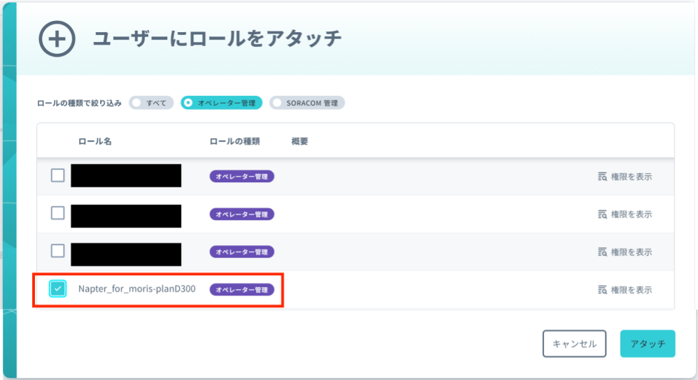 「ユーザーにロールをアタッチ」というモーダルダイアログが表示されますので、先ほど作成したロールにチェックを入れて「アタッチ」をクリックし、ユーザーにロールを割り当てます。