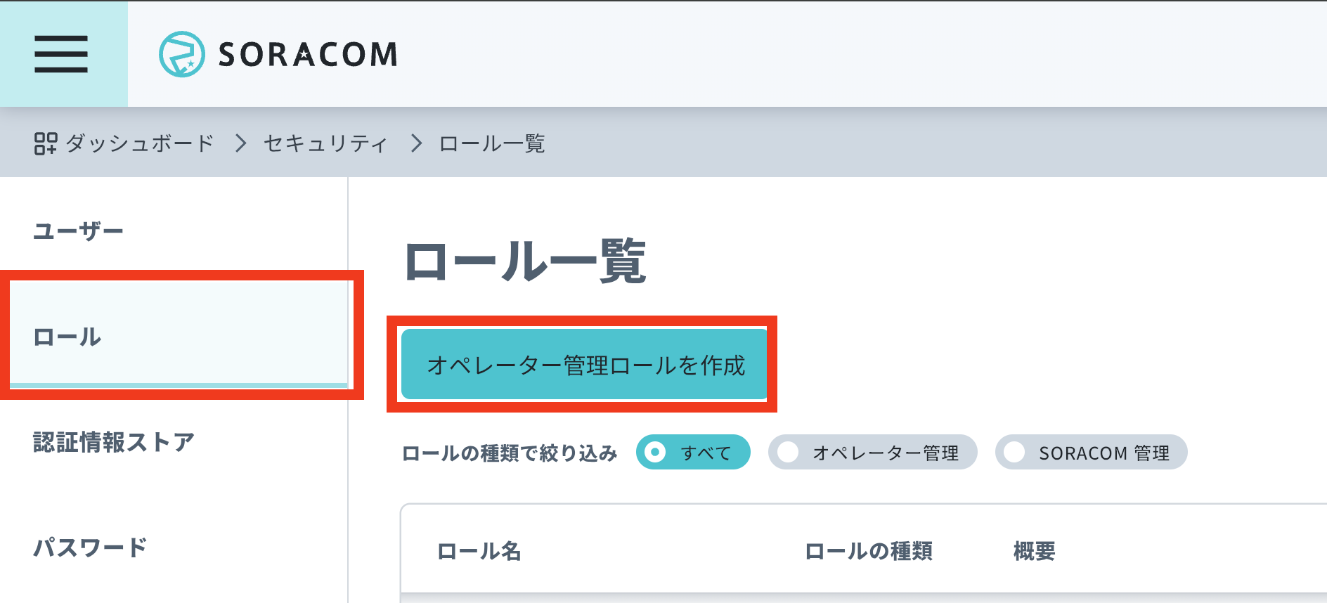 左のメニューから「ロール」を選択し、ロール一覧画面を表示します。さらに「オペレーター管理ロールを作成」ボタンをクリックします。