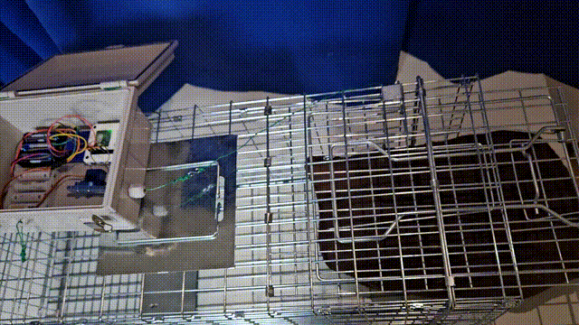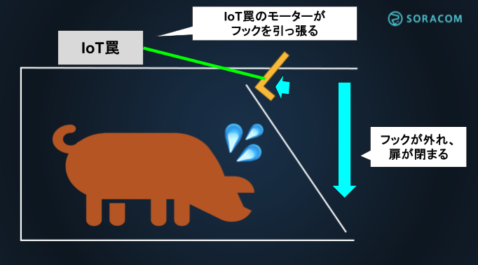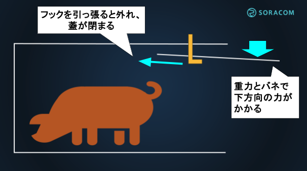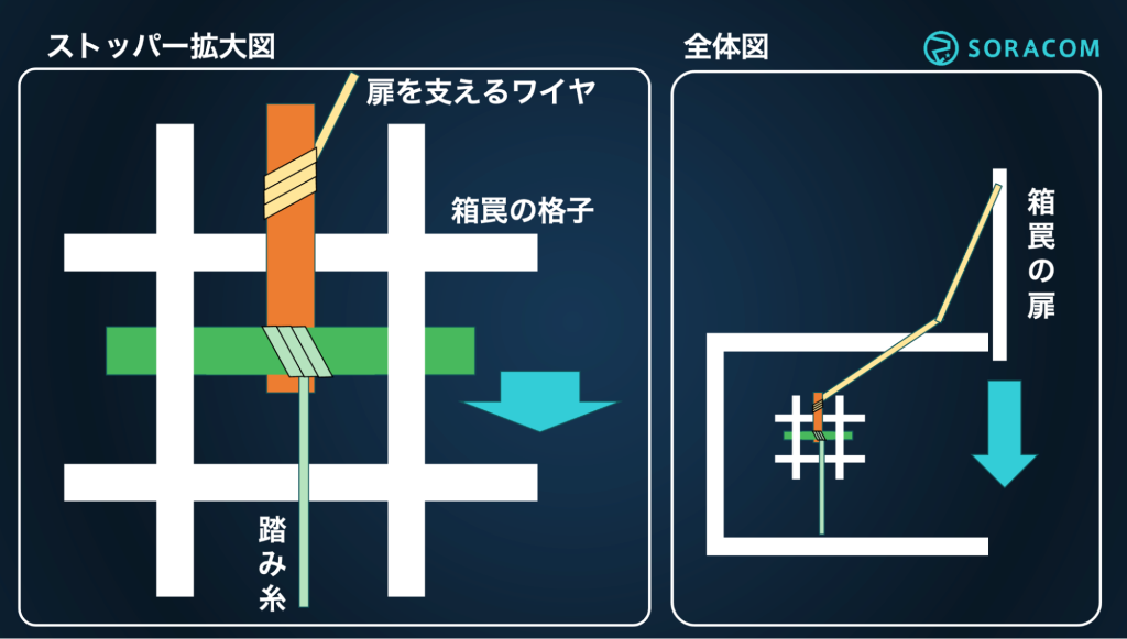 大型の罠では扉の重量をワイヤで支え、そのワイヤの反対の先端にストッパーをつけて箱罠の格子に引っ掛けます。獲物が踏み糸を踏むことでストッパーが外れ、扉が重力で落ちます。このストッパーを外す部分をモーターにやらせる、というイメージです。