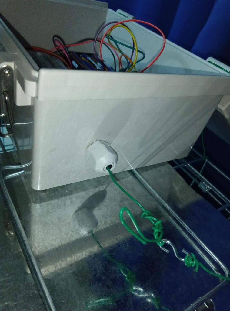 モータでフックを引っ張る以上、IoT罠の筐体を固定しなければいけませんが、今回はケースの都合上、こちらもワイヤを格子に巻きつけるなどして固定する必要がありました。