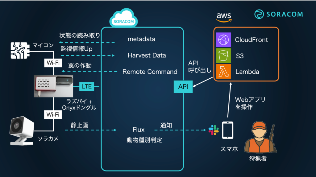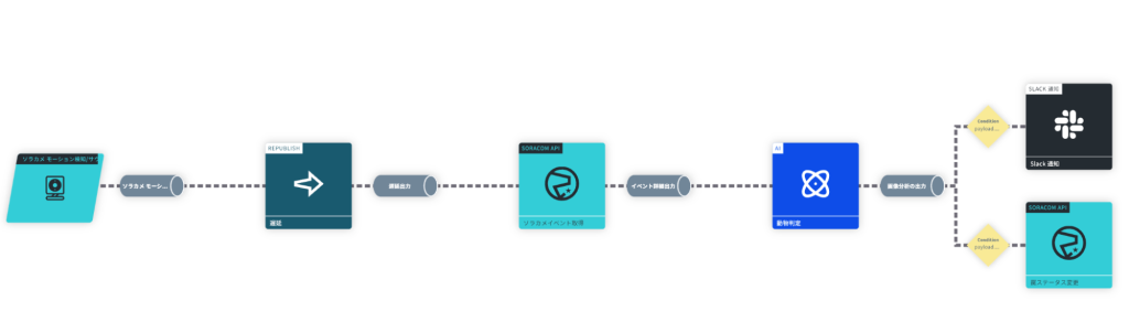 SORACOM Fluxを用いてソラカメの画像を判定し、動物が写っている場合はSlackに通知を出すといった仕組みも作成しました。
