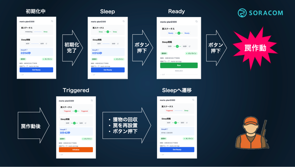 ワークフローを図示すると以下のようになります。一度罠が作動すると、獲物の回収や罠の扉を開けてフックを再度設定する必要があります。再設置作業を完了した後、「Initialize」ボタンを押すことで再びSleep状態に戻るようになっています。
