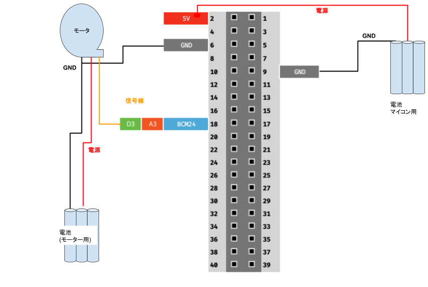 サーボモーターは必要な電流量が大きいので、WioTerminal からの給電では動かないようです。なので、マイコンの電源とは別に単三電池から電力を供給してあげます。