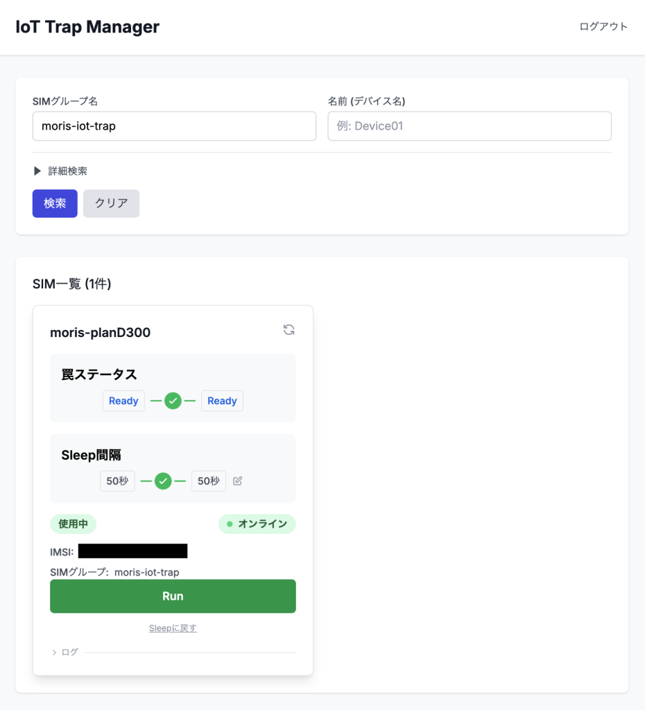 今回作成した IoT罠のWebアプリから「Run」ボタンを押すと、通信ネットワークで繋がった罠が遠隔で作動します。