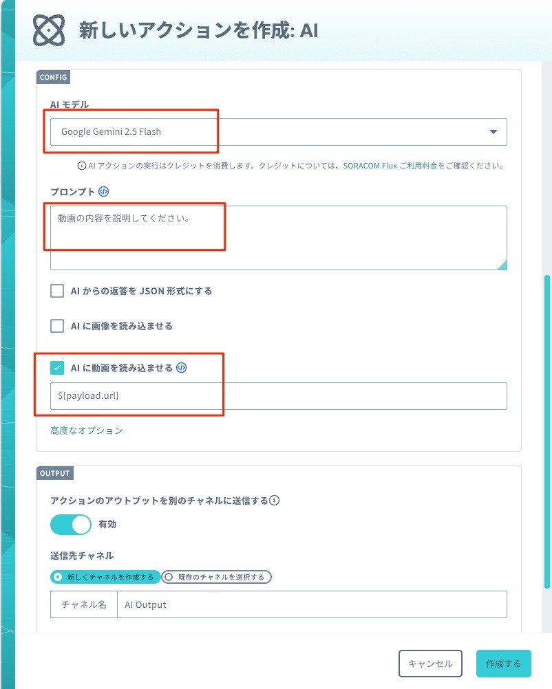 エクスポートが完了したら、いよいよAIで動画を解析します。ステップ 3 で作成したチャネルから AI アクションを作成します。