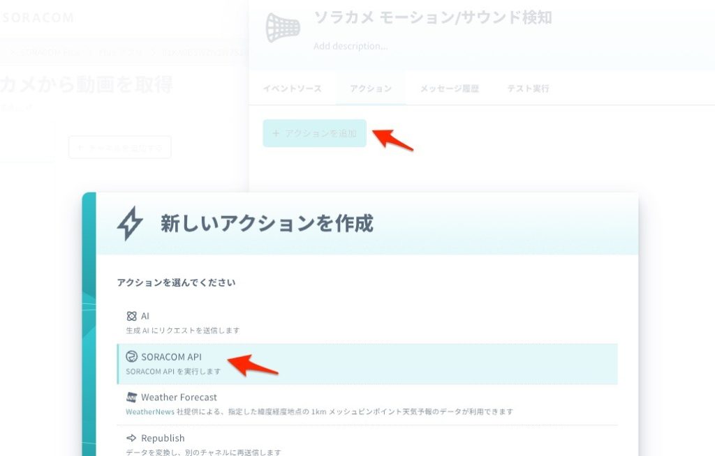 「ステップ1」で作成したチャネルを選択して、[アクションを追加]をクリックします。アクションとして[SORACOM API]アクションを選択します。