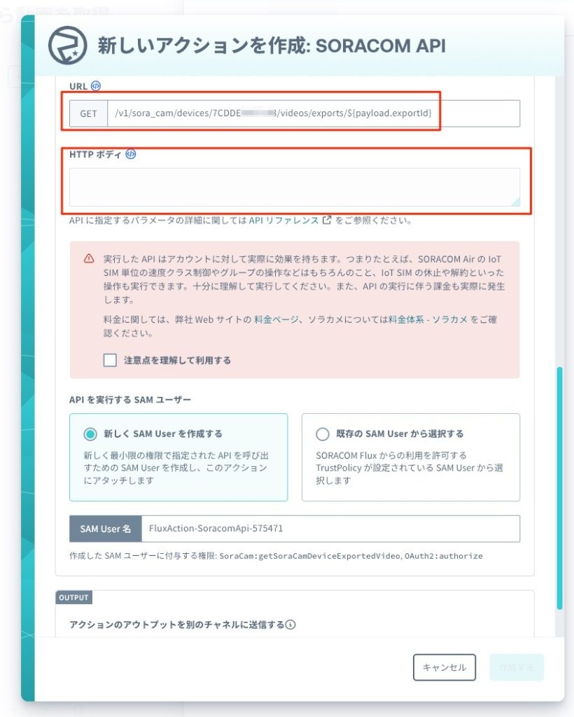 <device_id>には、対象となるソラカメのデバイス ID に置き換えてください。${payload.exportId}は、ステップ2 のAPIレスポンスに含まれるエクスポートIDを参照しています。Flux が SORACOM API を呼び出すときに置き換えるのでそのまま${payload.exportId}を記載してください。 SORACOM Flux では、前のアクションの出力がpayloadという変数に格納され、その中の値を${payload.キー名}で参照できます。