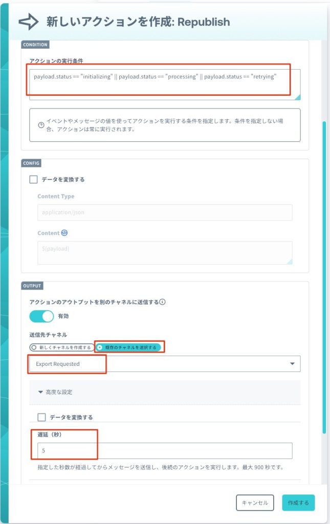 Republishアクションでは、数秒の遅延時間を設定してから、ステップ2「動画エクスポートのリクエスト」出力チャネルにデータを戻します。これにより、一定時間待機してから再度エクスポート状況を確認するループが形成されます。