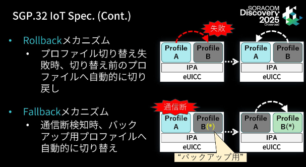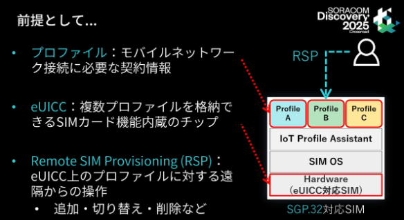 そして、eUICC上のプロファイルを遠隔から追加・切り替え・削除する仕組みをRSP(Remote SIM Provisioning)と呼びます。SGP.32は、このRSPをIoT用途に最適化した技術仕様です。