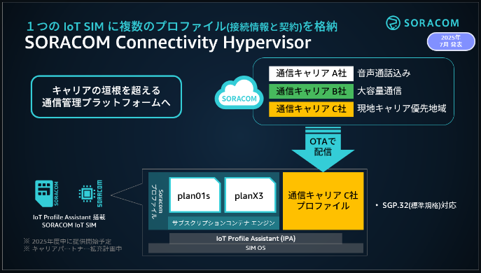 SGP.32への取り組みとあわせて、私たちは「SORACOM Connectivity Hypervisor」という新しい機能を発表しました。これは、SGP.32対応SIMと、SIMプロファイルの追加・切り替えをオーケストレーションするプラットフォーム機能を組み合わせ、IoT回線をより柔軟に管理するための仕組みです。